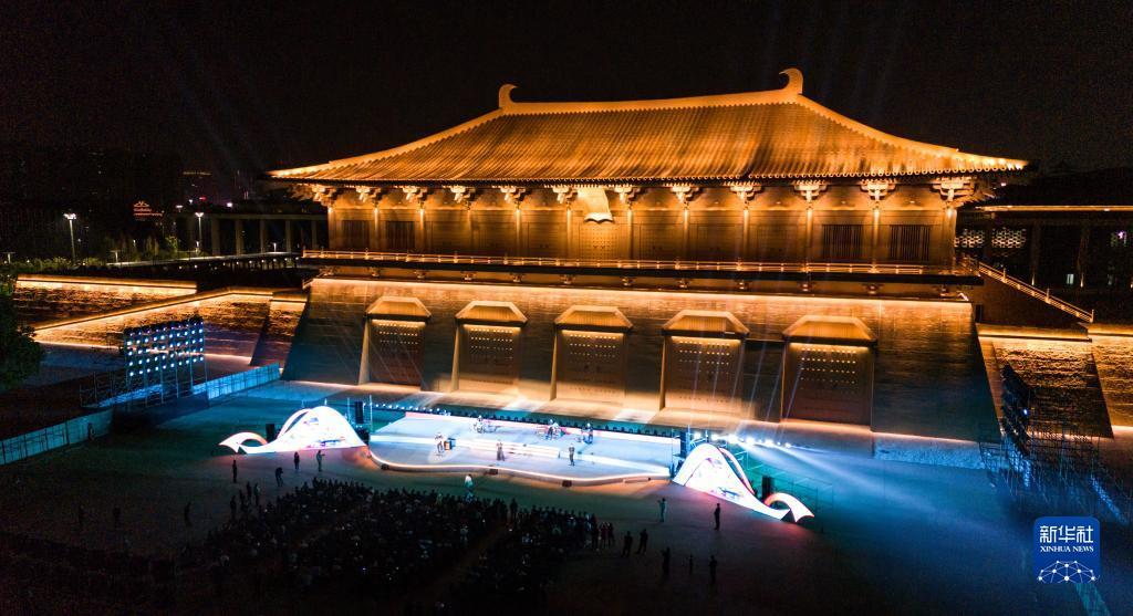 10月16日,在西安年夜明宮國家遺址公園,來自塞爾維亞的品牌活動飛龍和巴爾干城邦樂團進行專場互動裝置惠平易近表演(無人機照片)。